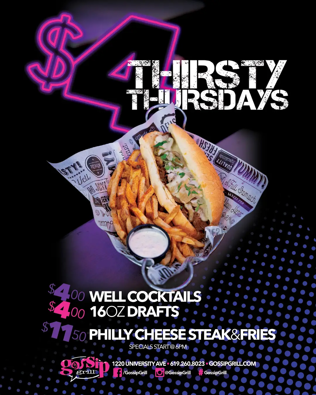 $4 Well Cocktails $4 16oz Drafts $11.50 Philly Cheesesteak & Fries
